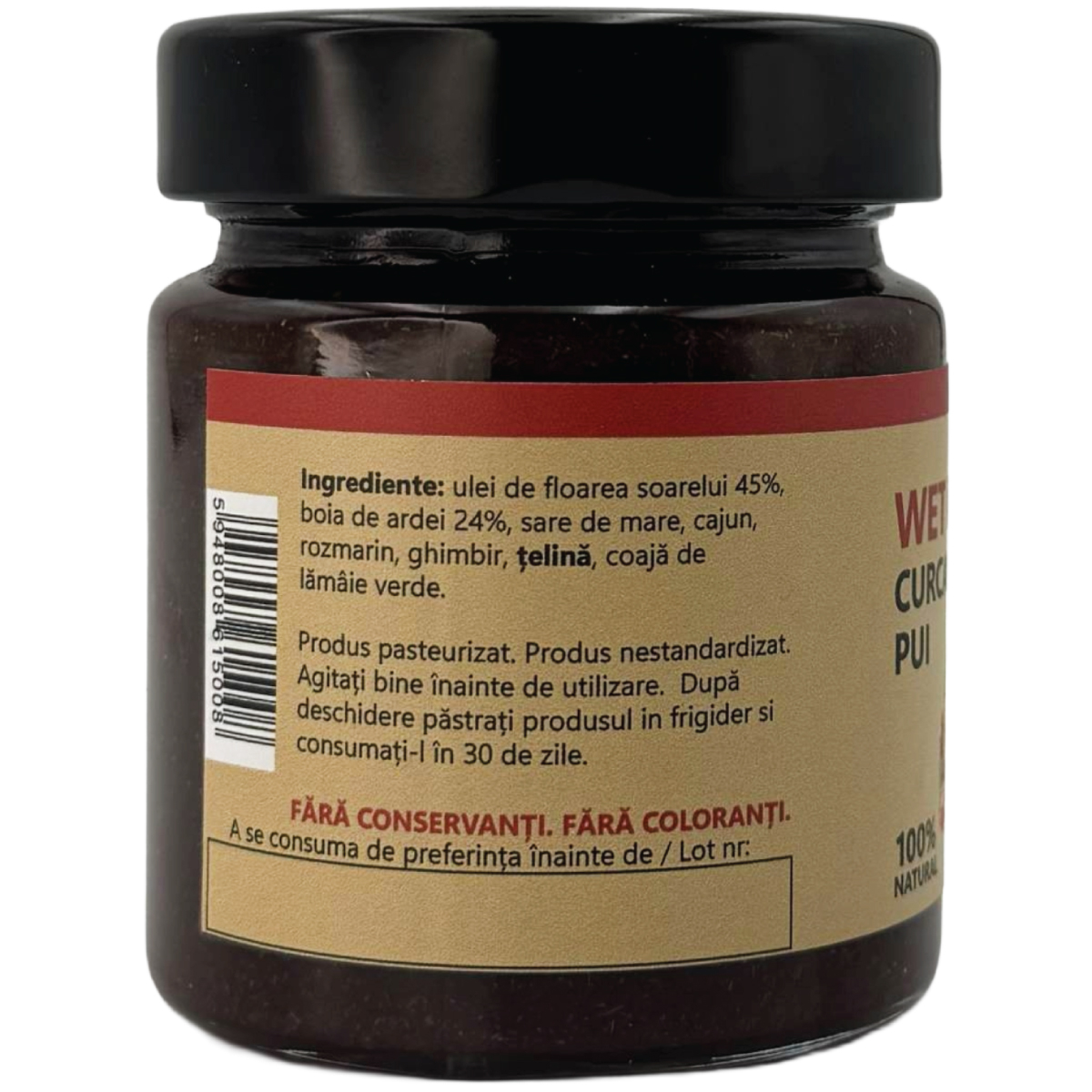 Ingredente: ulei de floarea soarelui 48,5%, boia de ardei 25%, sare de mare 7%, rozmarin, ghimbir, telina, cajun, coaja de lamaie verde